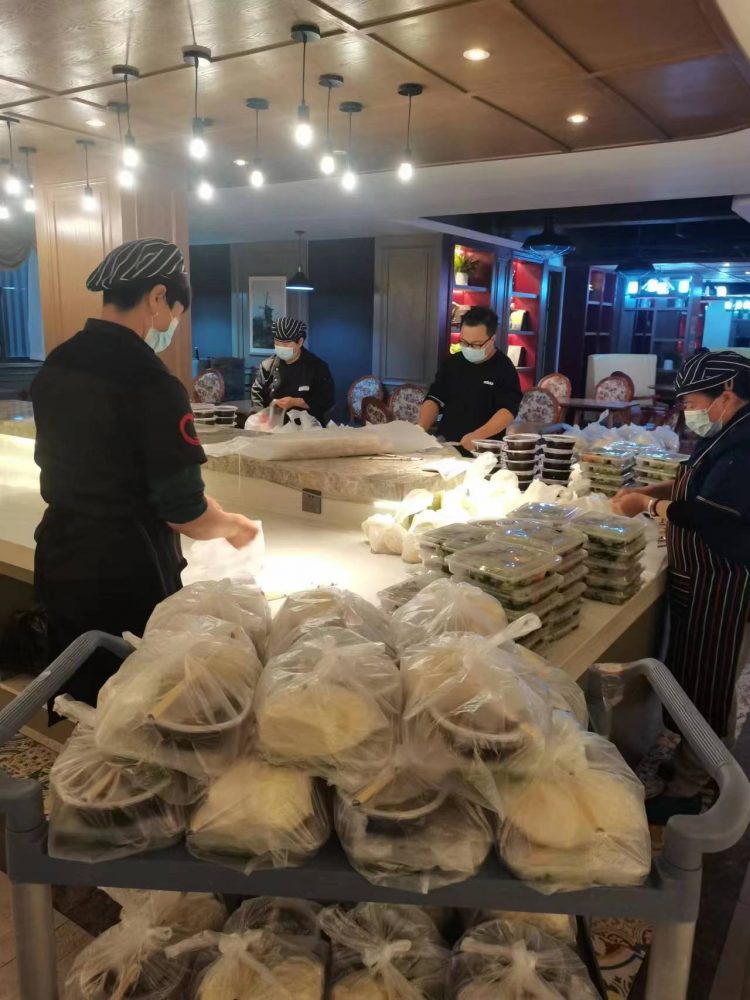 隔離點(diǎn)防疫工作者夜以繼日,“黨員先鋒隊(duì)”帶領(lǐng)酒店工作人員同隔離人員一樣閉環(huán)管理,24小時(shí)堅(jiān)守在酒店,保障所有被隔離人員和醫(yī)護(hù)人員每日三餐,每餐約150人,每日用餐約450人次。