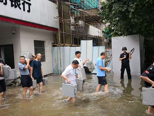 18日清晨6:30分,濉溪農(nóng)商銀行總行由于地勢低洼,加之雨勢較大,街道排水不暢,水位已達半米深,情況十分危急。農(nóng)商行領(lǐng)導(dǎo)高度注視,緊急從外調(diào)入沙袋進行抗洪搶險。關(guān)鍵時刻,淮北市保安有限公司駐濉溪農(nóng)商銀行三中隊的押運隊員們在中隊長劉軍的帶領(lǐng)下挺身而出跳入水中,奮力扛起沙袋,對銀行出入大門、金庫聯(lián)動門進行封堵。同時派駐陳體超,代亮亮、梁良、李晨晨、武成波、朱勝杰、楊海濤,劉翔兩個班組人員晝夜搶險,他們不怕臟、不怕累用水盆等工具將金庫內(nèi)的積水排出。經(jīng)過兩天一夜的奮戰(zhàn),汛情得到有效控制,挽回了重大損失,有力保障了濉溪農(nóng)商銀行正常的工作秩序。8月24日,濉溪農(nóng)商銀行的領(lǐng)導(dǎo)親自登門給公司送來錦旗,并對在抗洪搶險工作中表現(xiàn)優(yōu)異的押運班組表示慰問。
