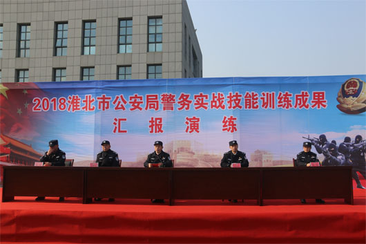 2018年12月25日上午9:25分,淮北市公安局警務(wù)實戰(zhàn)技能訓練成果匯報表演在市交警支隊訓練基地拉開序幕?;幢笔泄簿贮h委書記兼公安局長章銀發(fā)以及公安局所有二級機構(gòu)人員參加。